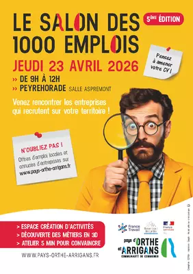 La Communauté de communes du Pays d'Orthe et Arrigans et ses partenaires France Travail et la Mission Locale des Landes, organisent une nouvelle édition du Salon des 1000 emplois, le JEUDI 23 AVRIL, de 9h à 12h, à la salle Aspremont, à Peyrehorade.